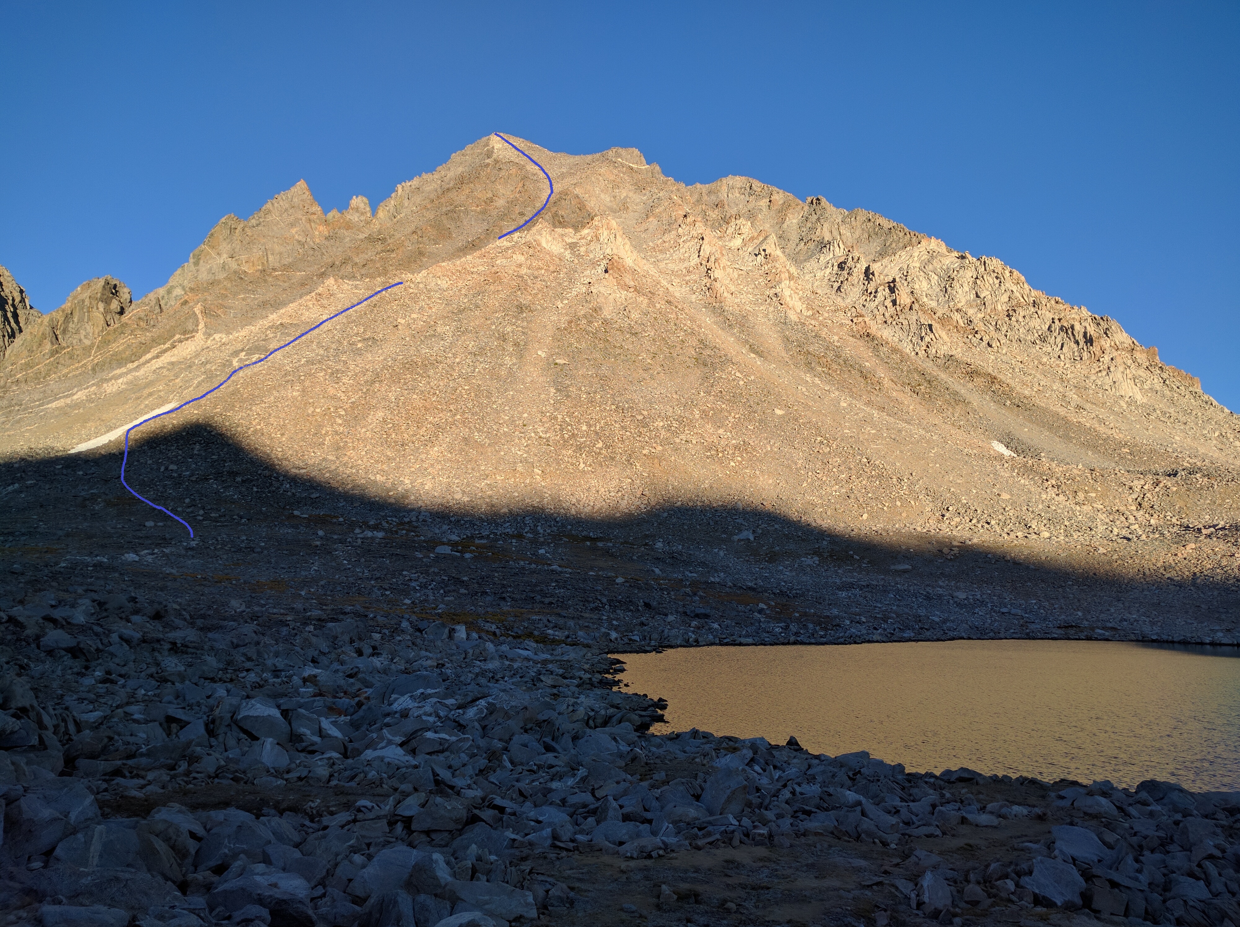 After a good night's sleep through a windless night I got up, prepared some oat meal and was off to get to the top of Mt. Agassiz by about 7:15am. I headed for the steep mountain in front of us ready to climb the 2000 ft to the top. Going for what looked like the most obvious route I found some cairns and use trail climbing up past a snow field on the northwest slope. The climb quickly turned into negotiating good size boulders. The cairns were hard to follow and I decided to just find my own way. I made decent time and was up on the peak in a little over 2 hours. Up there I took in the great views, snapped some pics and had a nice snack. Then I essentially followed the same route down that I had come up.