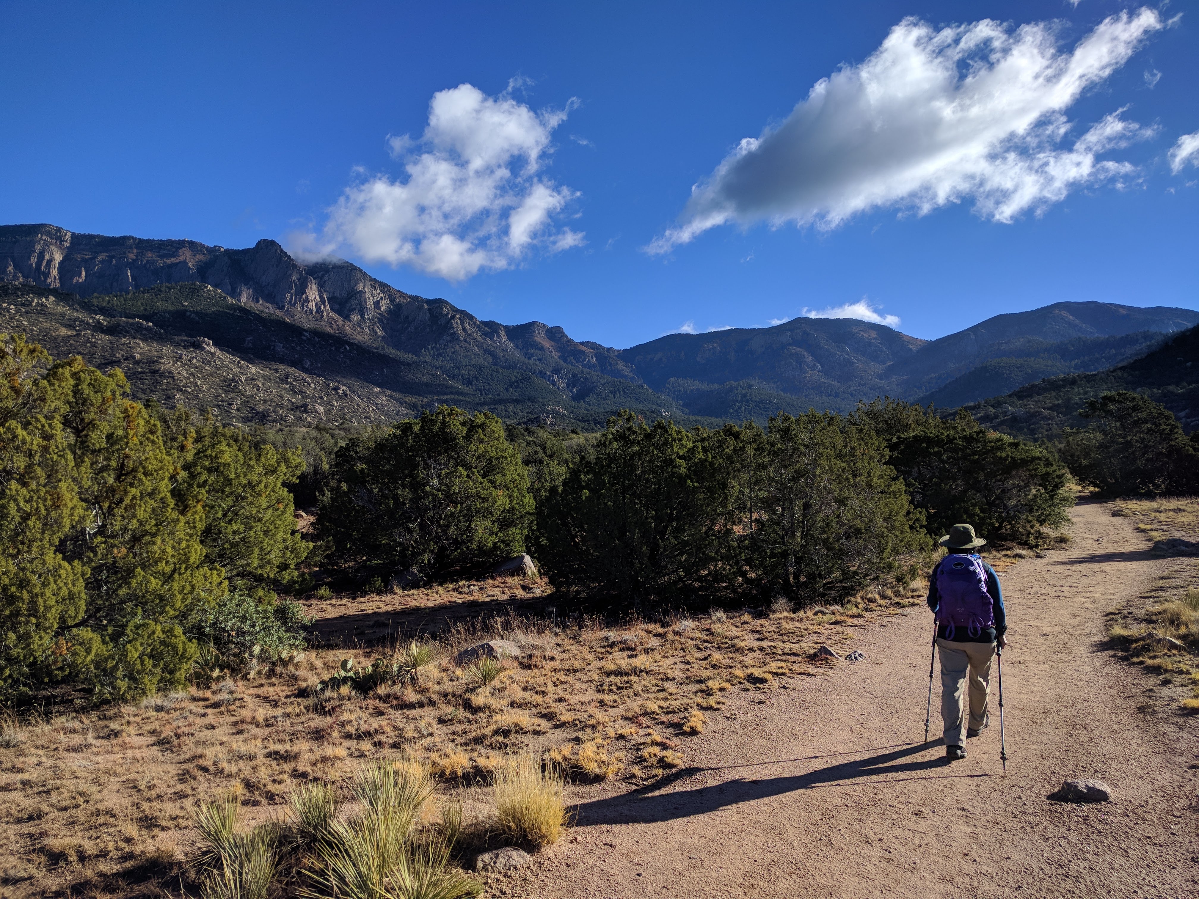 Previous Image Next Image IMG_20181025_093849 Hiking towards Sandia Crest; Saddle above hiker is the Pino trail terminus